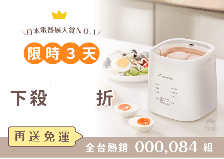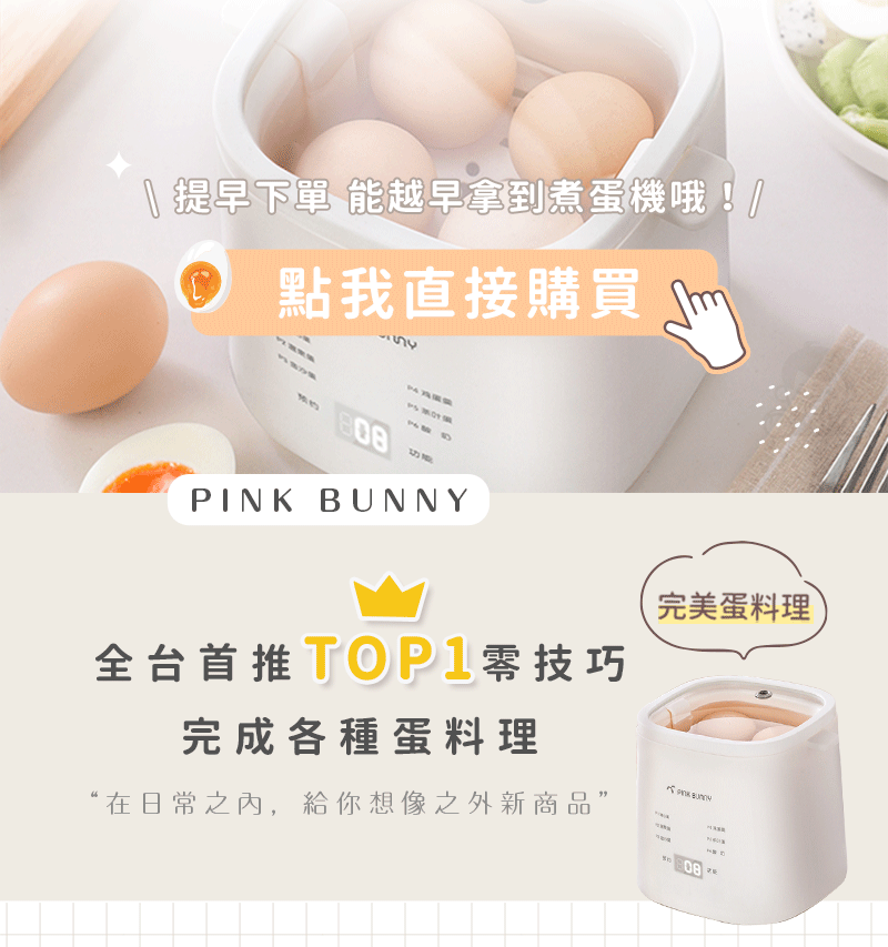 15分鐘前Pink Bunny智能煮蛋機智能控溫烹煮,營養美味輕鬆上桌 - Pink Bunny智能煮蛋機1入組 NT$1090